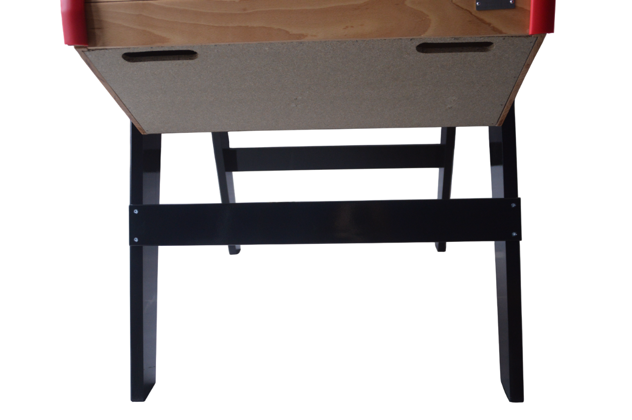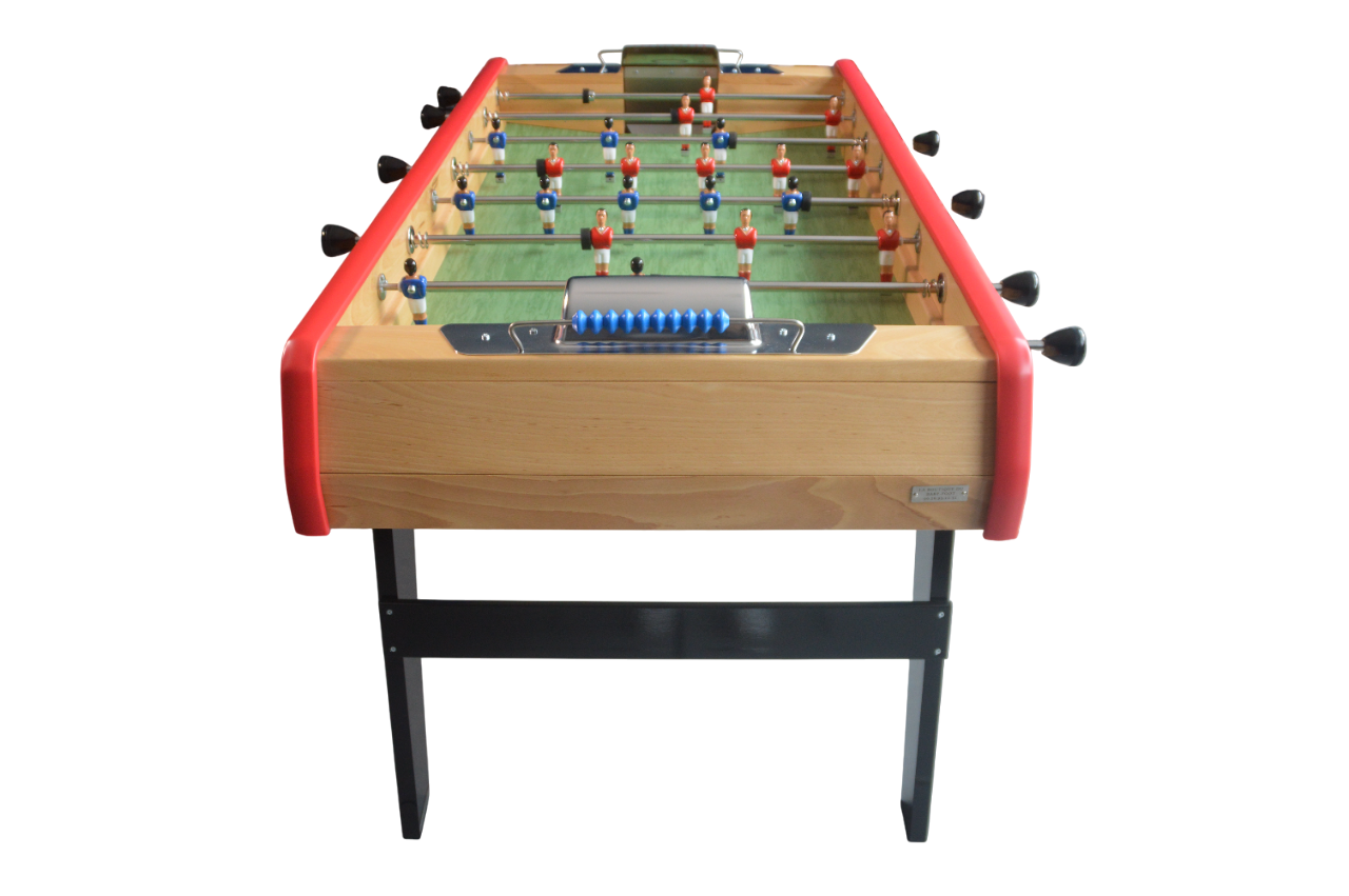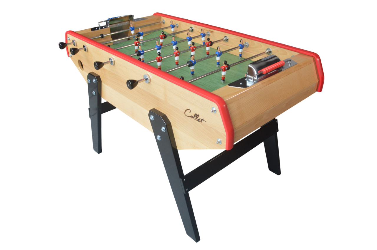 Ce modèle emblématique associe un vernis incolore au bois massif, des pieds laqués noirs et le duo de joueurs rouges et bleus sur tapis vert, pour un style traditionnel et intemporel, fidèle à l’esprit du baby-foot d’origine.