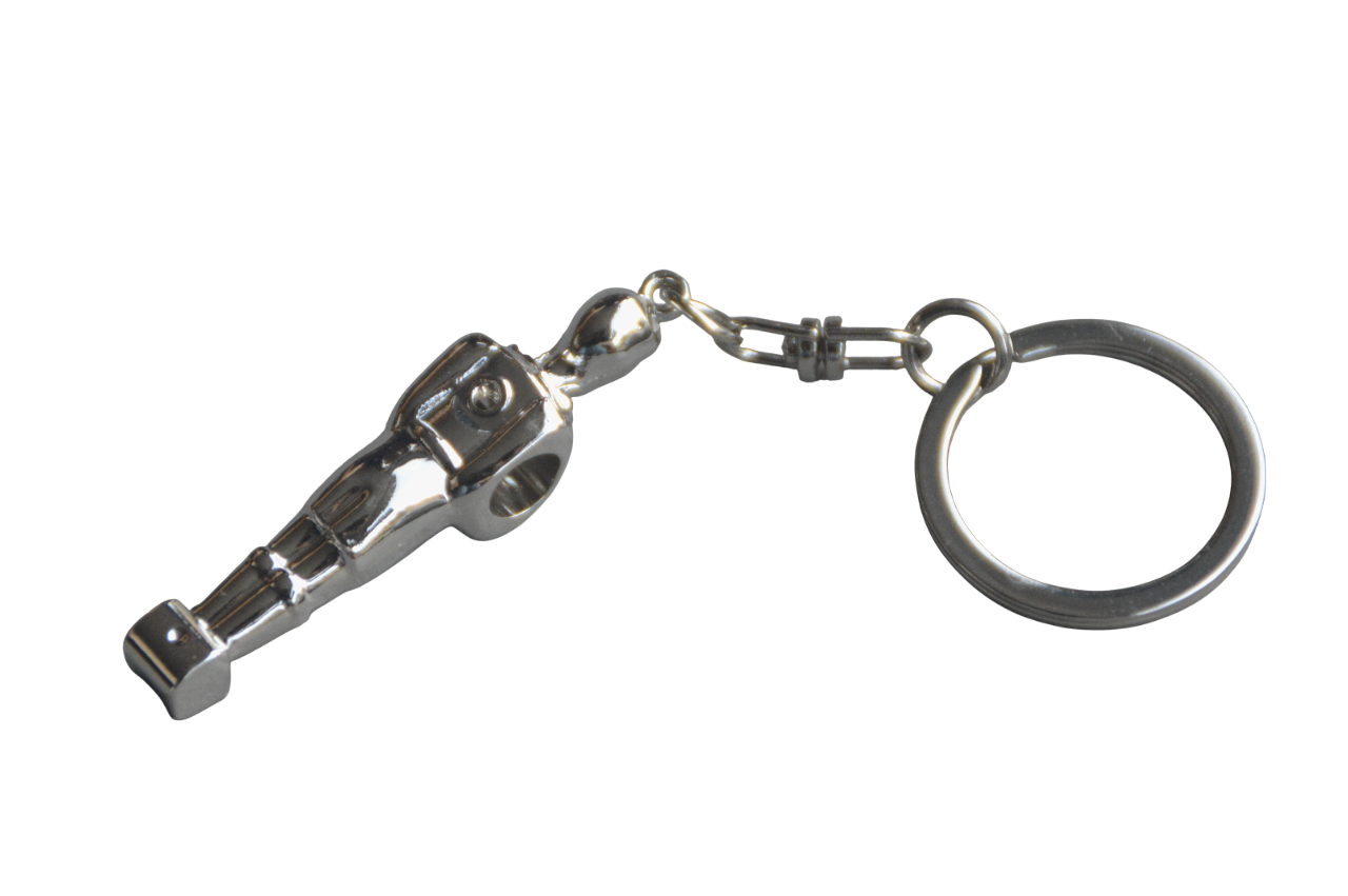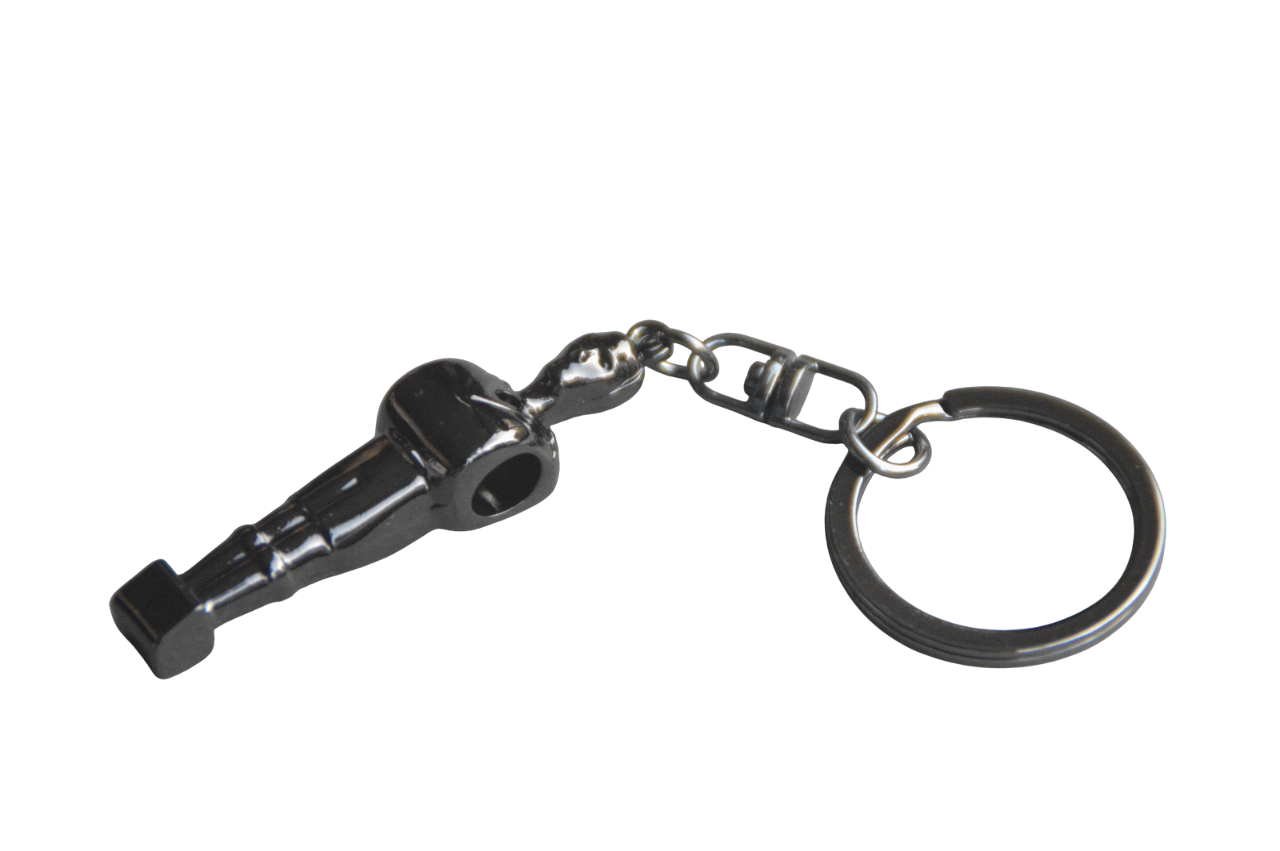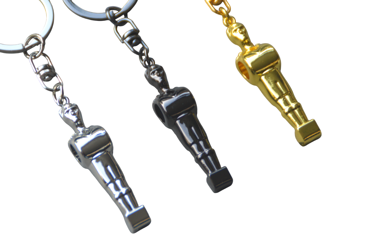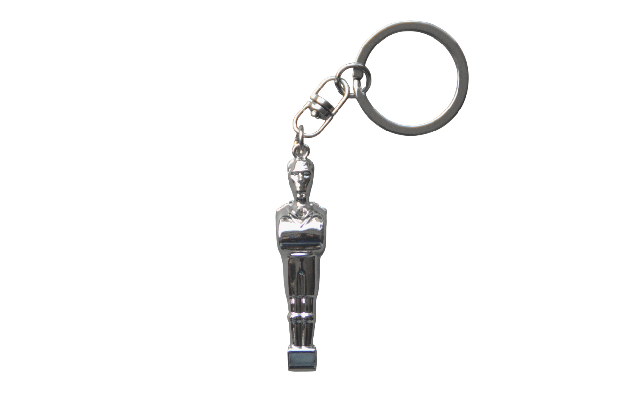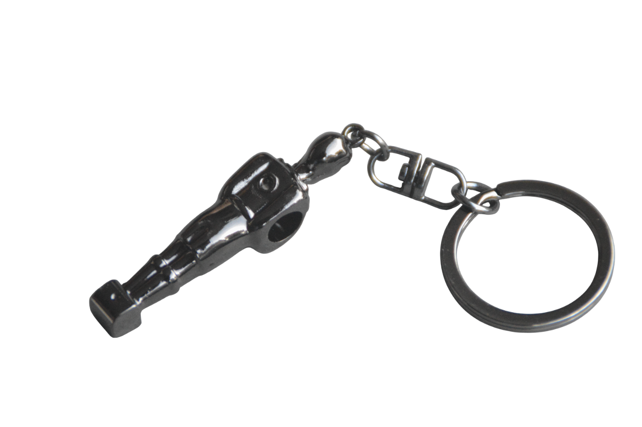 Ce porte-clé en forme de joueur de baby-foot est fabriqué en métal et recouvert d'un placage de haute qualité, disponible en trois finitions : argenté, noir et doré